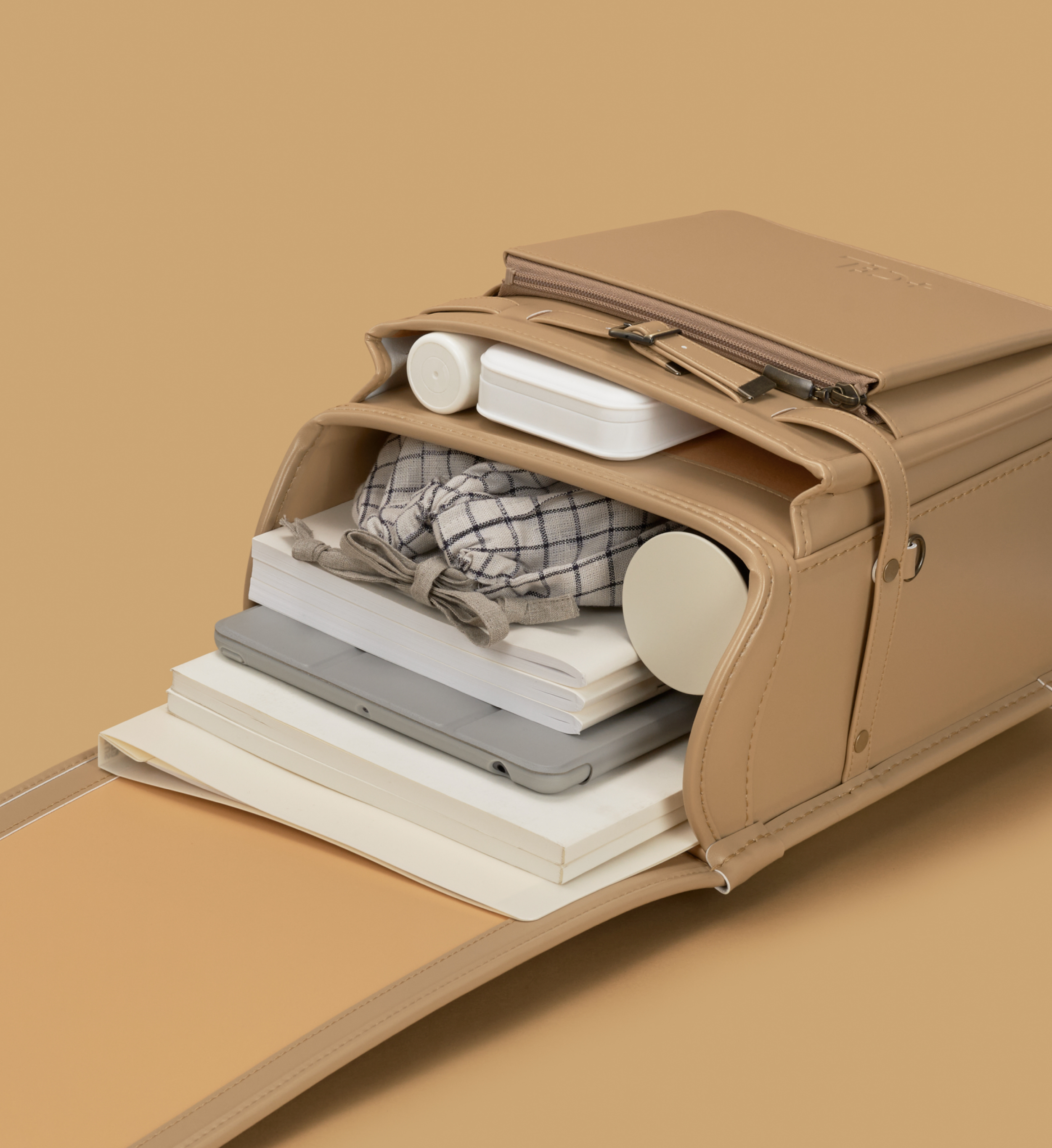 +CELのランドセルは、全モデルがA4フラットファイルのサイズが収納可能です。内寸は12.5cmと、しっかりと容量を確保しています。教科書やタブレットを入れ、さらに水筒や上履き、体操着などを入れる余裕もあって、荷物が多い日でも安心です。たくさんの荷物を入れても型崩れしにくいよう補強されています。