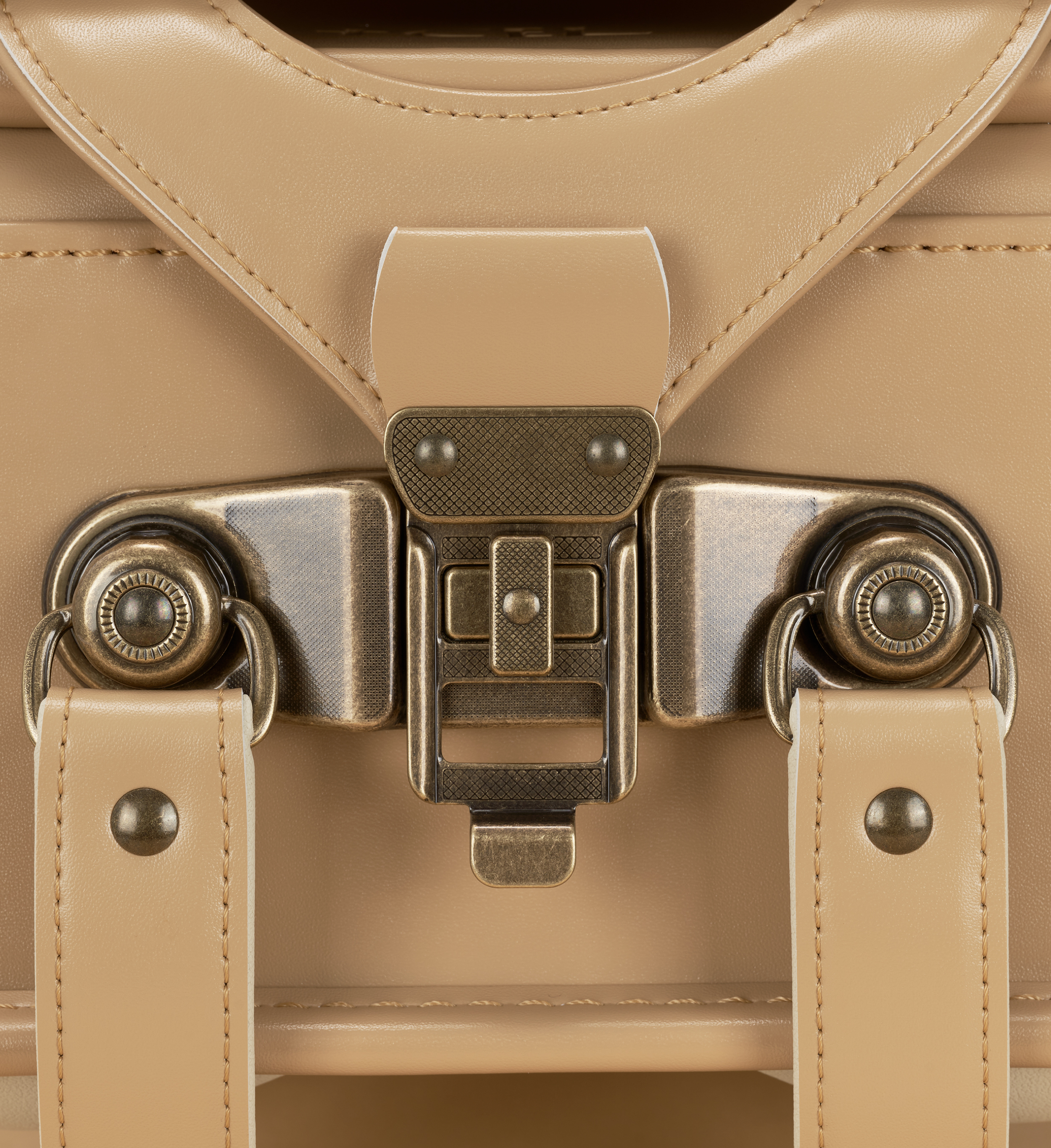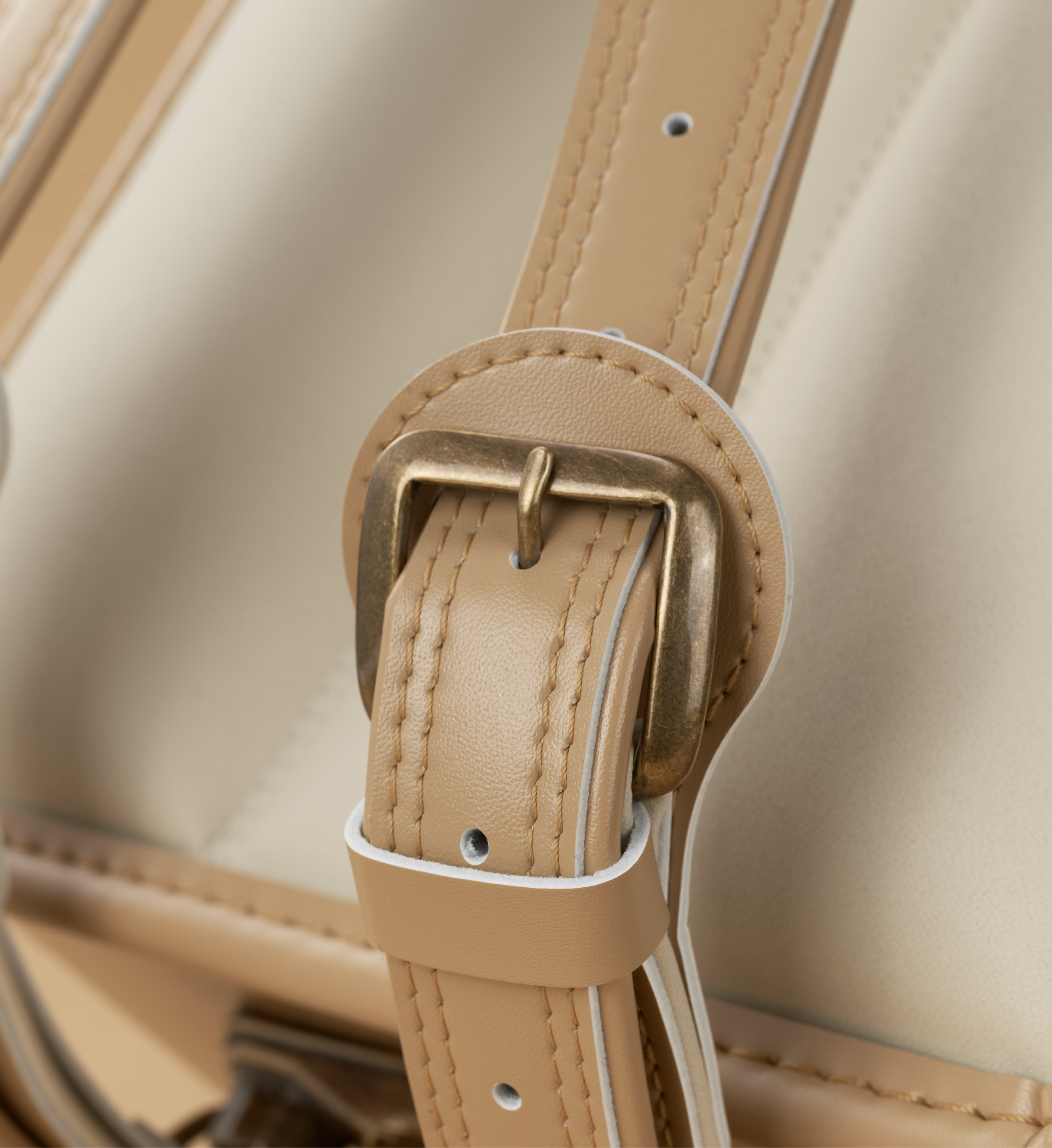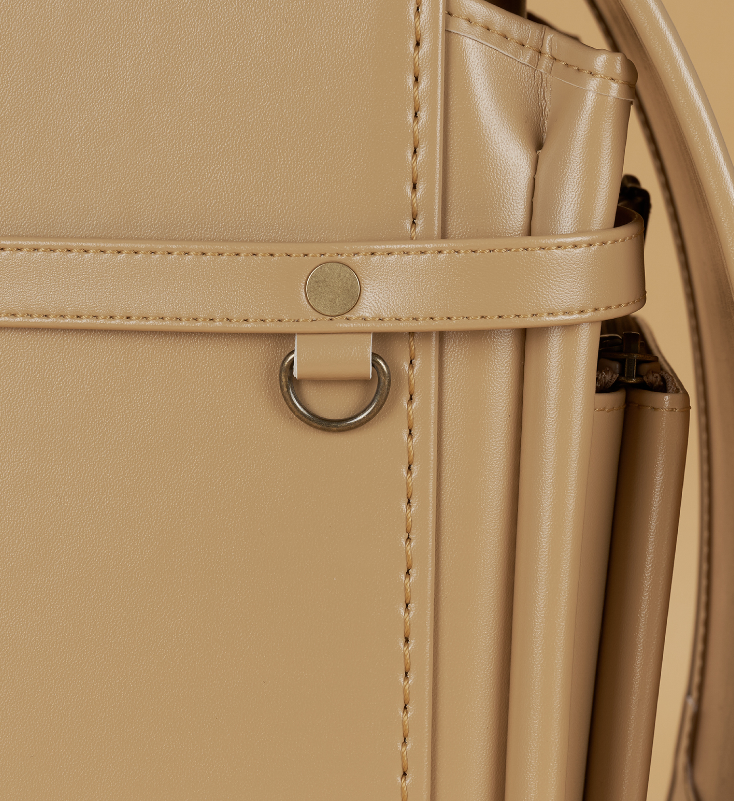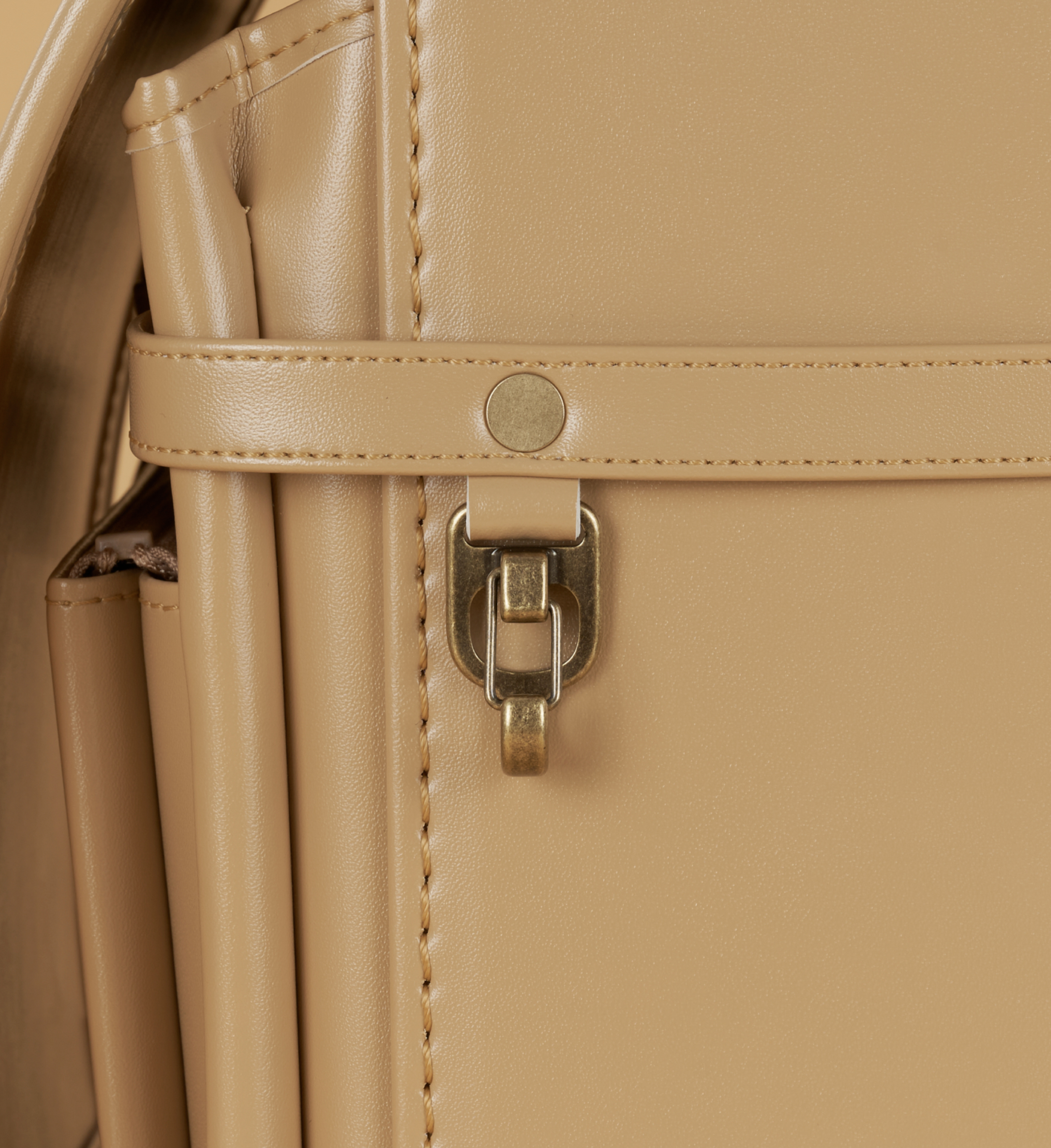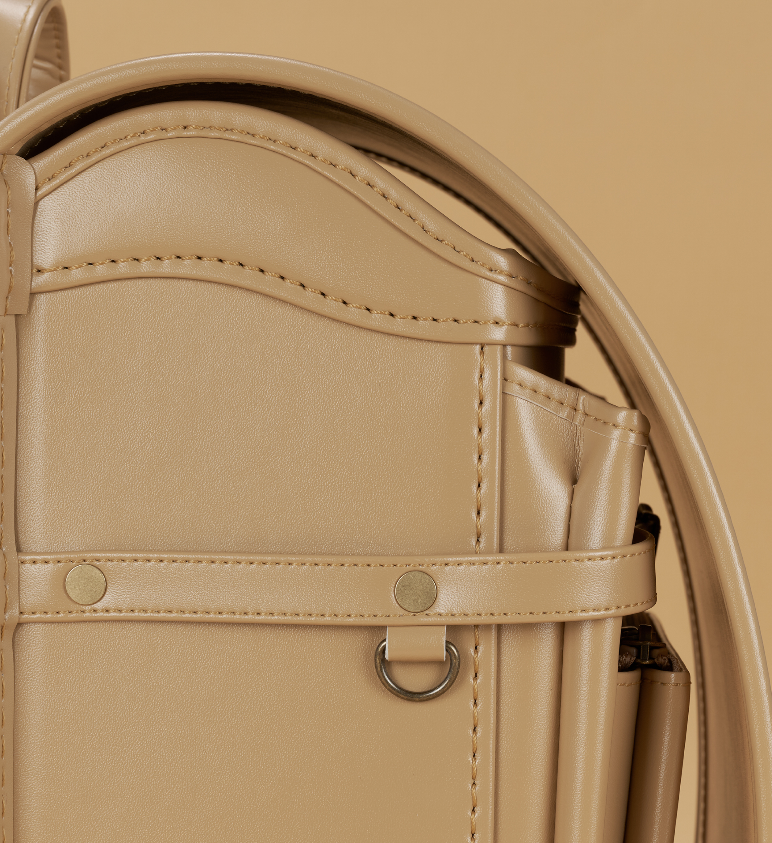 付け根部分が立ち上がった肩ベルトは、背中の高い位置で重心を安定させ、背負った時には軽く感じられます。わき腹に沿わせてひねり具合を変えられる下ベルトと、低反発と高反発を組み合わせたクッションは、ランドセルと背中を密着させ、負荷を分散させます。側面と底面には一体型のプレートを二重にして入れ、さらに細部をワイヤーや樹脂で補強してあるため、つぶれにくく型崩れしにくい構造です。外からの力や水にもとても強い人工皮革を採用しています。