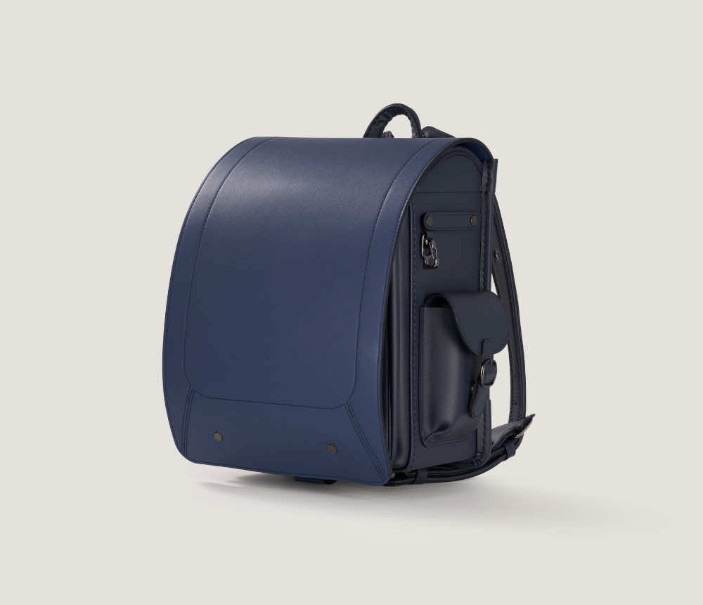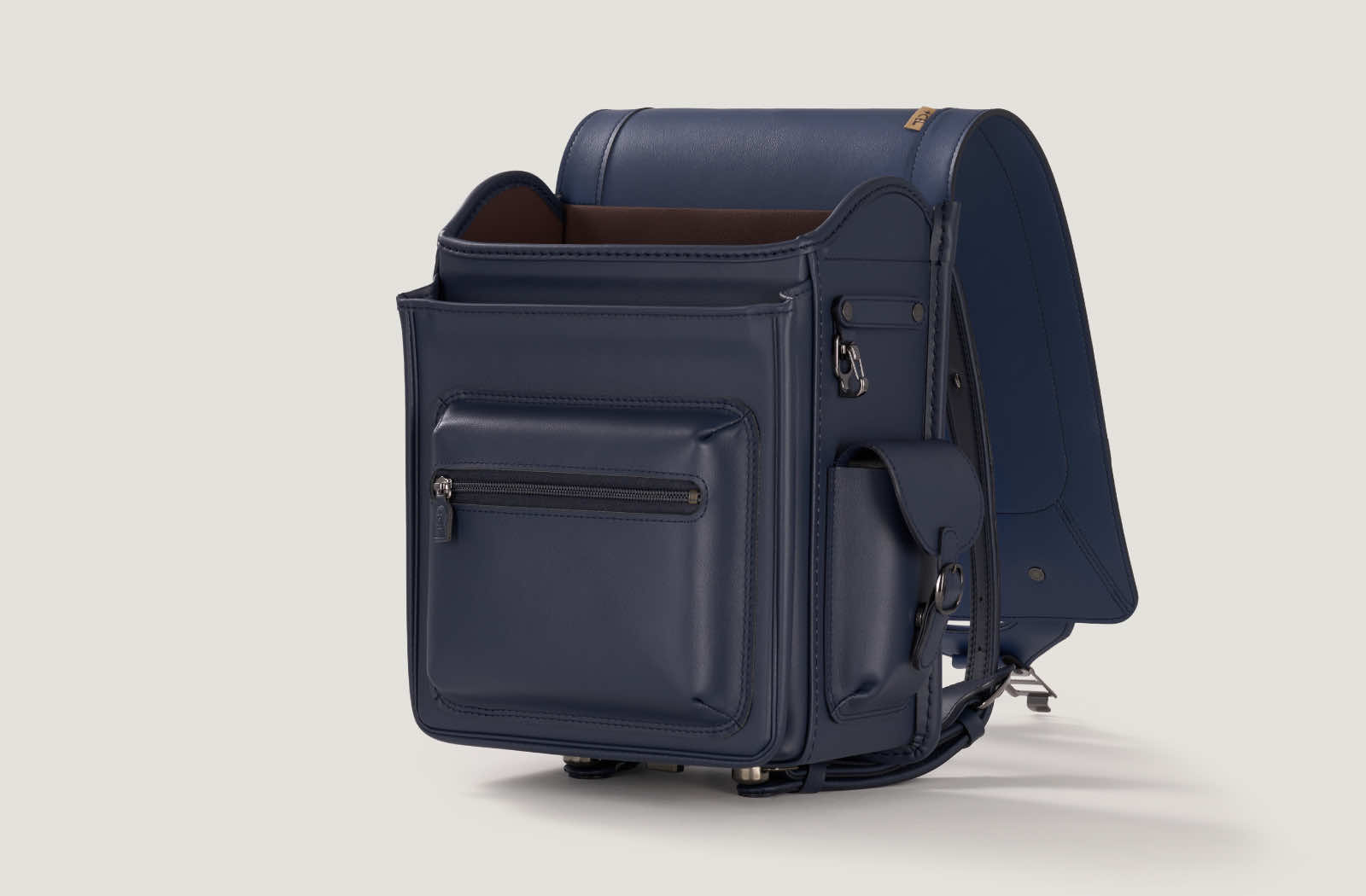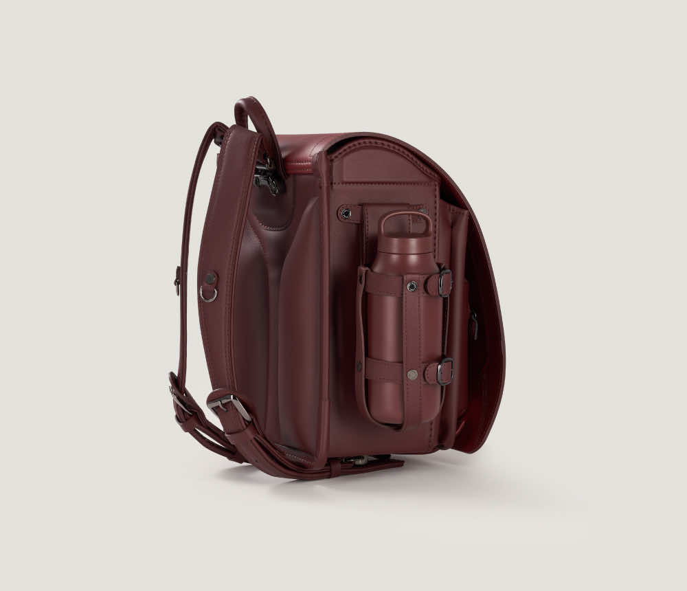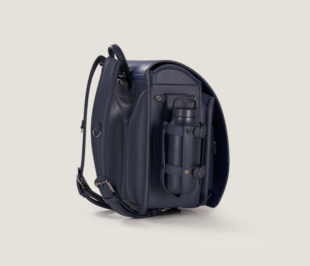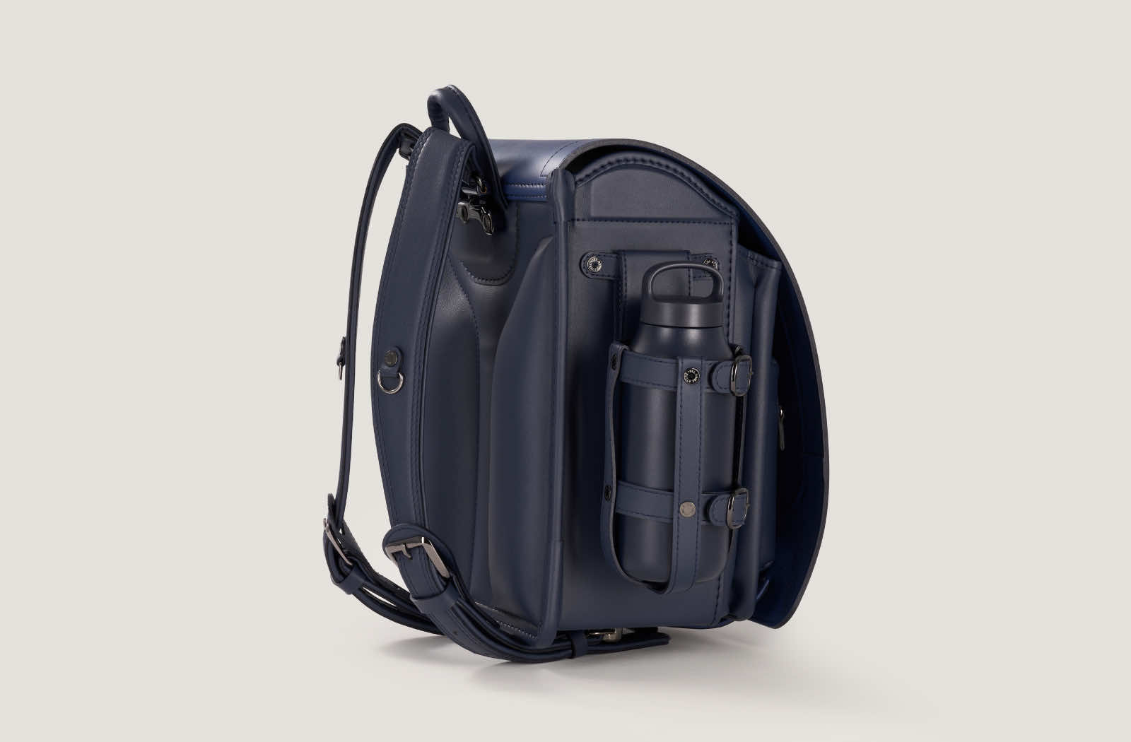 「かぶせ」のあるランドセルらしい形をしていますが、素材を組み合わせた専用のボトルケースをサイドに配するなど、新鮮な印象に仕上げました。デザインを手がけたのは、プロダクトデザイナーの柴田文江さん。人工皮革でありながら切り端を磨き上げるコバ処理を施したり、フロントポケットをマチ付きの立体的な形状にしたり、細部まで徹底した心配りがされています。その佇まいに合わせて、落ちついた6色の展開です。