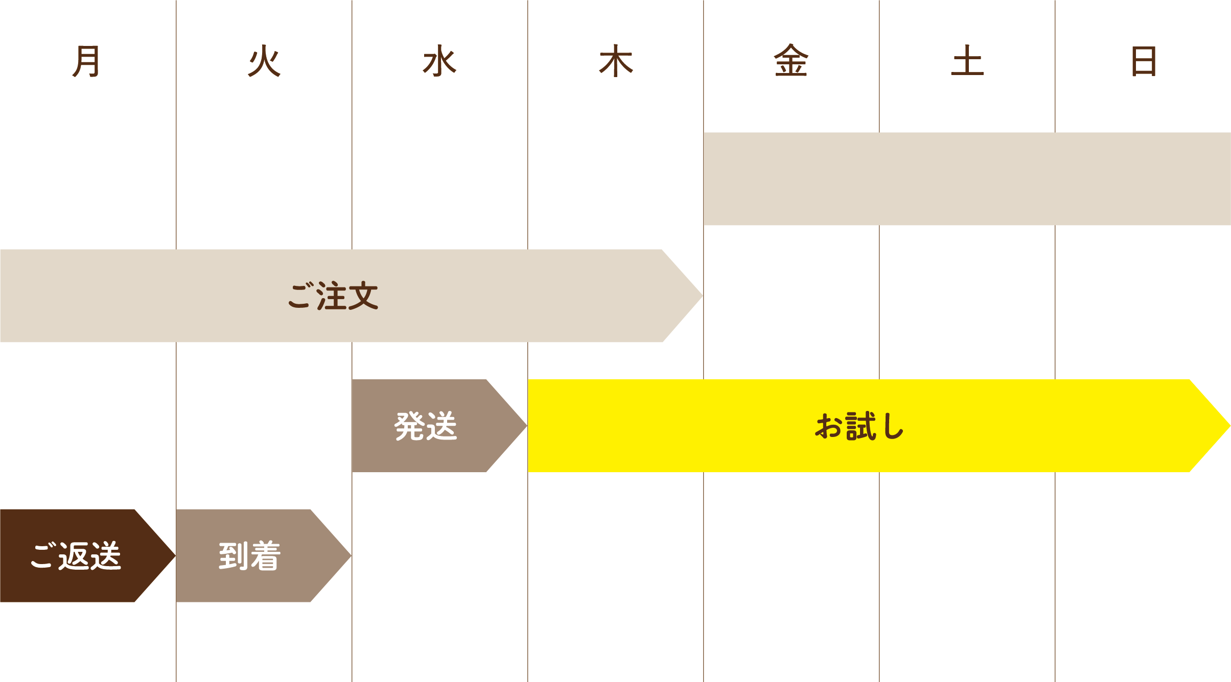 毎週木曜日までのご注文を翌週水曜日に発送します。木曜日~月曜日の間にお試しいただき、月曜日中にご返却をお願いします。